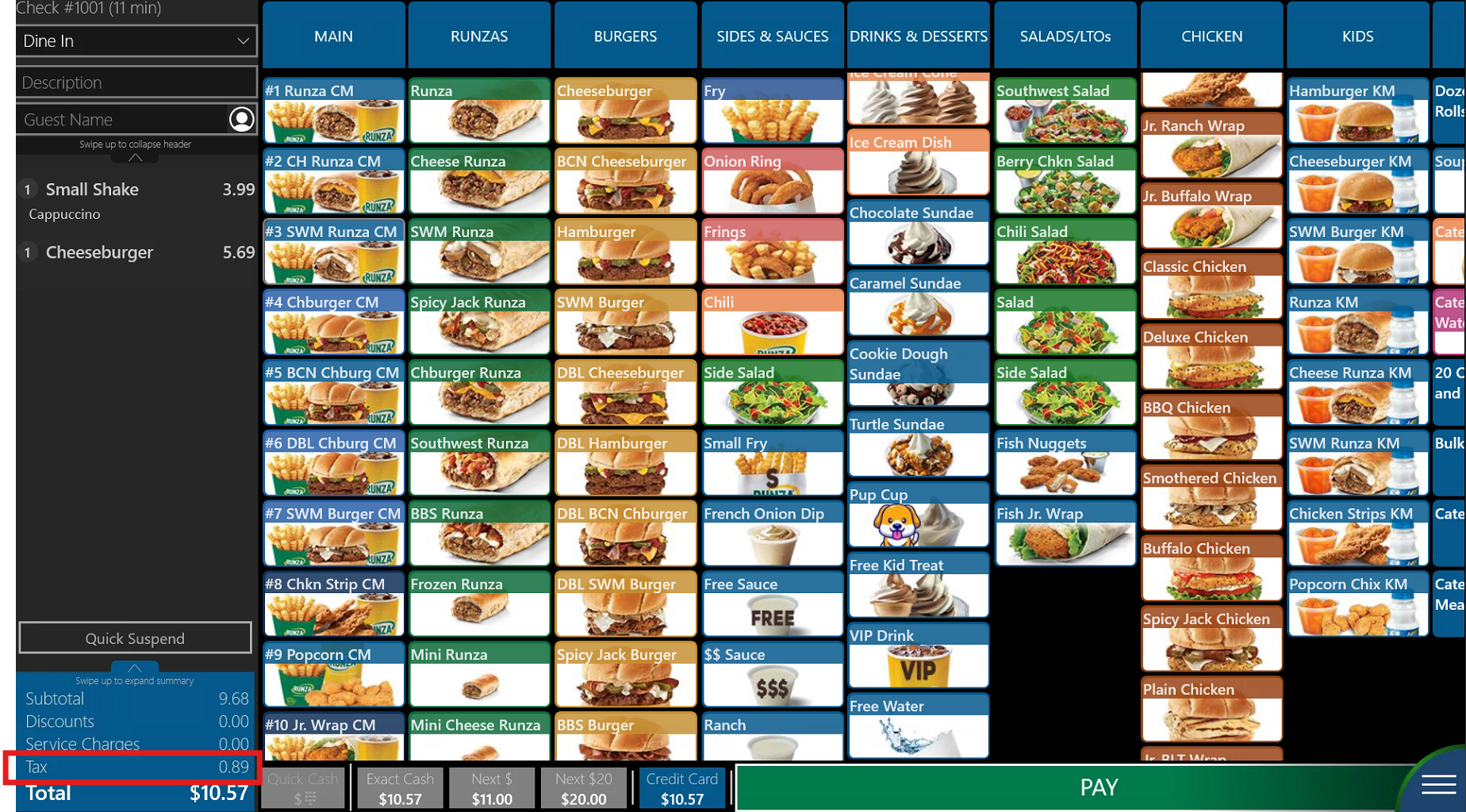 1. Ring in the customer's order as usual, then tap the Blue Hamburger Menu button at the screen's bottom right. (Notice that you can view the applied tax in the Check Summary View section.)